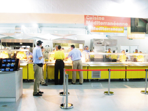 西餐由意大利面、批萨、牛扒、沙拉等组成,奥运牛扒为了保证品质,选用的扒炉为美国引进的火山石扒炉。丁老师和外籍厨师一起煎牛排,他说:“今天我起码煎了1000块牛排。”