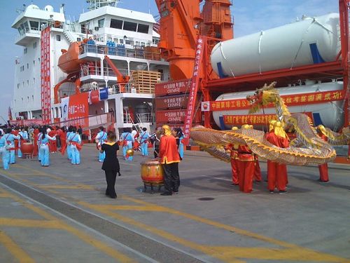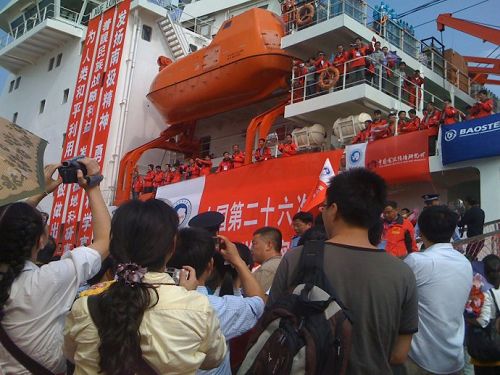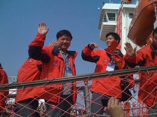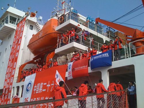 当天的外高桥科考专用码头,彩球飘荡,彩旗飞扬,“雪龙”号科考船装扮一新,等待启航。当国家海洋局负责人下达出发令时,“雪龙”号拉响了长笛,码头上锣鼓掀天,龙狮劲舞,烟花绽放,场面十分壮观。