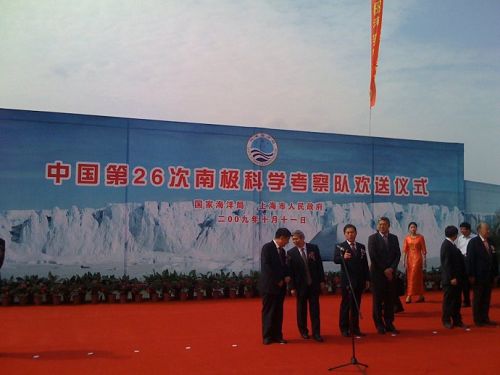 中国第26次南极科考首批165名队员11日出征,国家海洋局、上海市人民政府在码头举行了隆重的送行仪式,院长张元树、副院长王清华作为南极科考队输送队员单位领导,应邀参加了仪式,与雷竞技官网3名师生亲切话别。