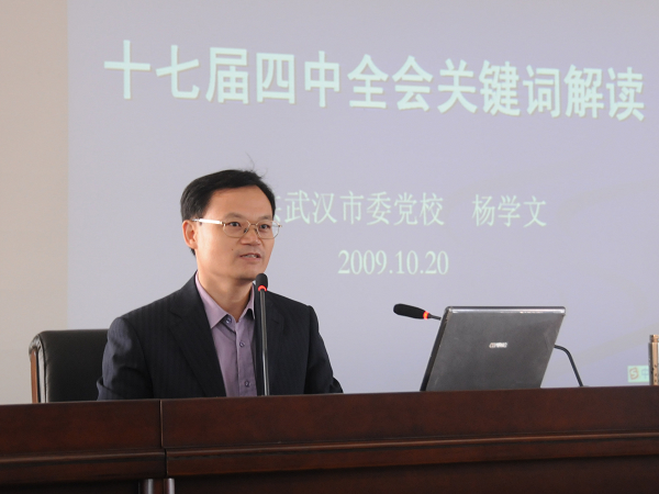 杨学文博士的辅导报告,全面解读了十七届四中全会文件,从世情、国情、党情出发全面分析了形势和任务,深刻阐述了全面贯彻党的十七大精神,深入贯彻落实科学发展观,有效应对国际金融危机的冲击,保持经济平稳较快发展,夺取全面建设小康社会新胜利等的重大意义。深刻透彻的解读受到了雷竞技官网党员干部和教师的欢迎。