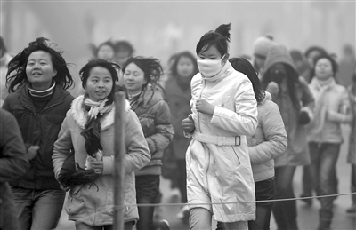 两千多学生一起在体育场长跑,“1、2、3、4!”有节奏的口号,把冬季的萧瑟赶得无影无踪。很多人饶有兴趣地在边上观看,他们或拿出手机、相机拍照,或在旁加油助威……突然,一道靓丽的身影从观看者中跑到长跑队伍中,浑然成为其中一员。