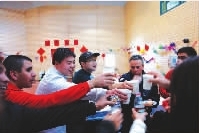 礼尚往来,智利海军送来三文鱼,徐康给智利海军站队员敬酒。
