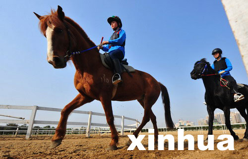 3月17日,准骑师董敏等(左一)在训练中。新华社记者 程敏 摄