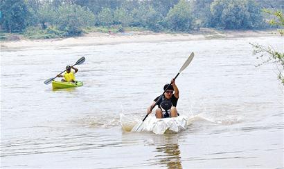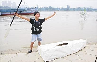 昨日上午10时26分,在汉江汉阳赫山段,水流湍急,水速3米/秒。面对滔滔江水,武汉商业服务学院的大三学生王璐瑶,坐在自己用废纸糊好的一艘纸船上,激流勇进。7分钟后,他顺利摆渡到对岸的汉口,实现了他试航汉江的愿望。