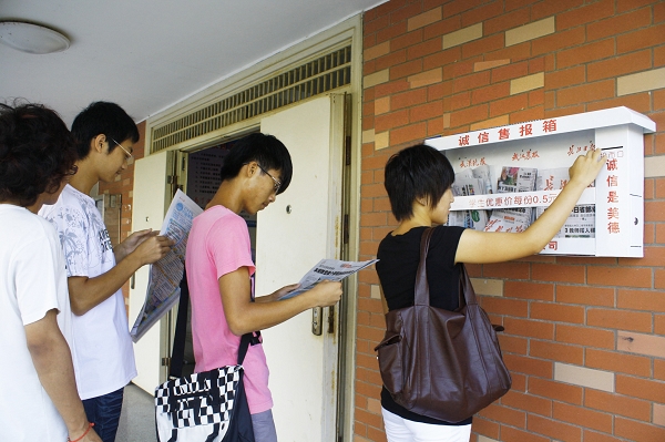 武汉商业服务学院一些学生公寓门口,近日出现了15个无人售报的“诚信报箱”(上图),学子们不出公寓,将零钱投到报箱旁的投币口,就能看到当天的《长江日报》、《武汉晚报》和《武汉晨报》。