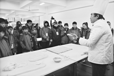 在一条新鲜鳜鱼的鱼身打上十字花刀,放入油锅炸成金黄色,起锅,装盘,浇上番茄汁……昨日下午,武汉商业服务学院烹饪与食品工程学院实训室内,3名操着英语的小“主厨”,把刚刚学做的茄汁菊花鱼端到了中国烹饪大师戴涛的桌前,等待他的点评。