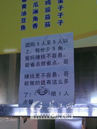 (长江网i新闻记者王亚兰)“团购5人至5人以上,每份少5角,爸妈挣钱不容易,能省就省点。哥能做的只有这么多了。限一人点餐。”在武汉商业服务学院锦园餐厅一“炒饭哥”温情广告,引得众多学子追捧。