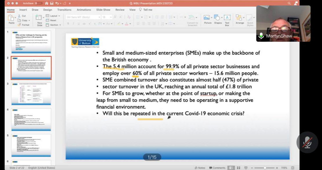 本网讯 7月16日及7月23日,英国博尔顿大学教授、.国际注册会计师马丁教授(Martyn Shaw)应邀通过云端为雷竞技官网工商管理学院18级、19级财务管理ACCA班师生作题为“企业纾困融资问题及对策”的讲座。
