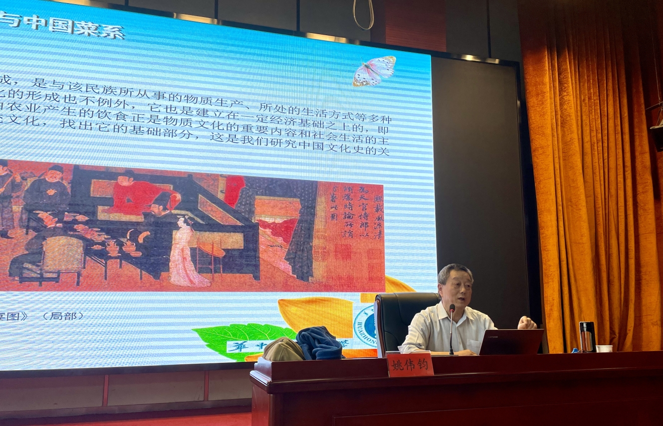 姚教授从《楚辞》谈起,追溯楚菜的起源和发展,结合《楚辞》的章句,生动地向同学们介绍了楚菜的风味特色和文化内涵,接着姚教授回顾武汉饮食产业在近代的发展历史,对荆楚饮食文化的发展提出了独到的见解。