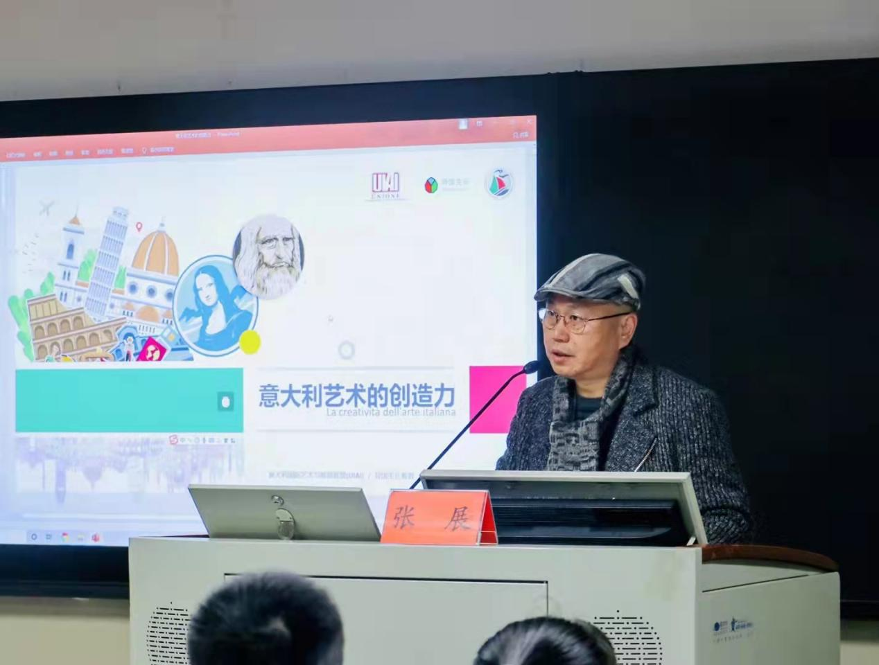 本次致远讲坛特邀湖北省文联委员、湖北省美术家协会理事、意大利国际艺术与教育联盟执行主席、世界华人美术教育协会艺术委员会主任张展先生作为主讲嘉宾。张展老师结合自身旅意经历以及艺术创作经验,为同学们深入浅出地介绍了意大利各时期不同形式的艺术和在世界艺术史上的地位,以文化、设计、艺术为方向,多角度、多维度地让同学们了解到意大利文艺复兴至近代时期的艺术脉络的起源、创新与发展,用艺术的方式去启迪学子们的创造创新意识以及自身的个性化思维,同时也更加直观的展现了意大利文化艺术的极大魅力。