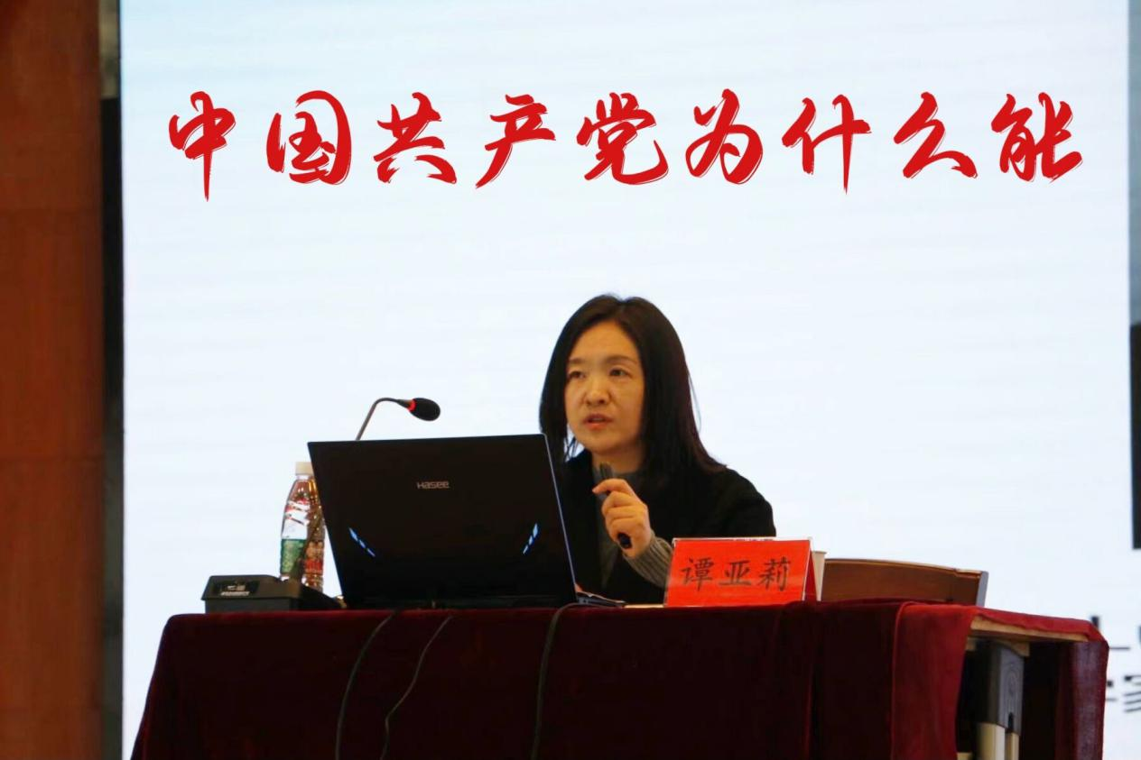 本网讯 11月23日下午,华中科技大学马克思主义学院副院长、思想政治教育博士生导师谭亚莉教授受雷竞技官网经济学院邀请作主题为“中国共产党为什么能”的专题讲座,全校200余名师生到场聆听。