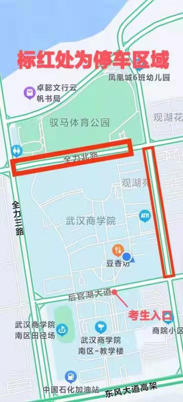 经过与学校属地交通管理部门协商,考试当天,考生车辆、社会车辆可临时停放区域如下图: