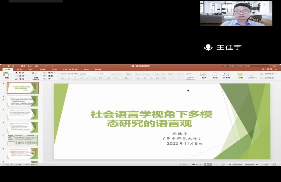 王教授首先对传统的语言观进行了梳理,接着从多模态结构中的语言、作为多模态结构的语言、后人文主义的语言感知(在中国的背景下)三个方面展开,总结了社会语言学和话语研究中语言观的嬗变和新发展。王佳宇教授指出随着全球化的日益深入和通讯技术等的进步,语言观发生了新的变化:即将语言视作一种多模态符号或将语言本身视为多模态。在对这两种新的语言观进行分类阐述时,王教授结合国内外社会语言学领域出现的关于语言研究的新概念和新方法,探讨了语言的本体论问题,如什么构成了语言,语言在多模态实践中的地位、研究路径及语言研究在中国语境下的本土化等问题。