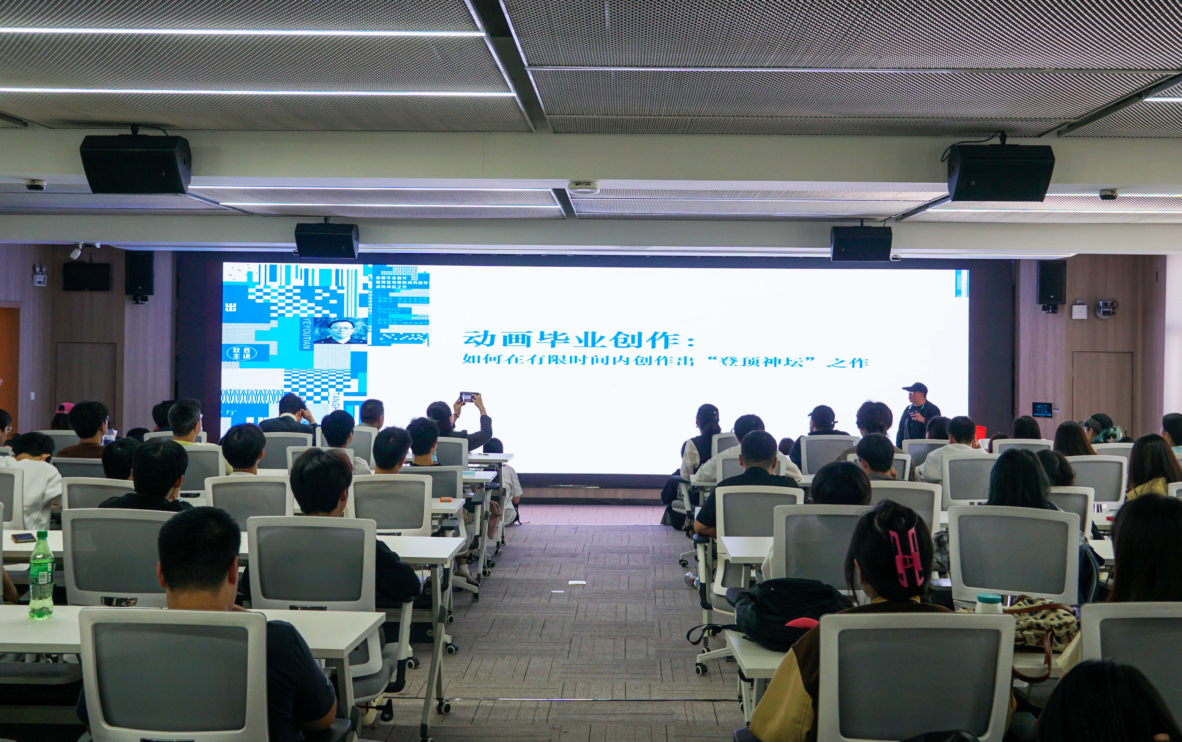 在讲解后,唐红平还为在场学生带来许多优秀毕业设计作品,在一幕幕富有色彩、寓意深刻的动画短片中,同学们深受启发。最后,他还鼓励同学们要勇于尝试、敢于创新,这为即将毕业的学子在毕业设计的灵感获得上树立信心。
