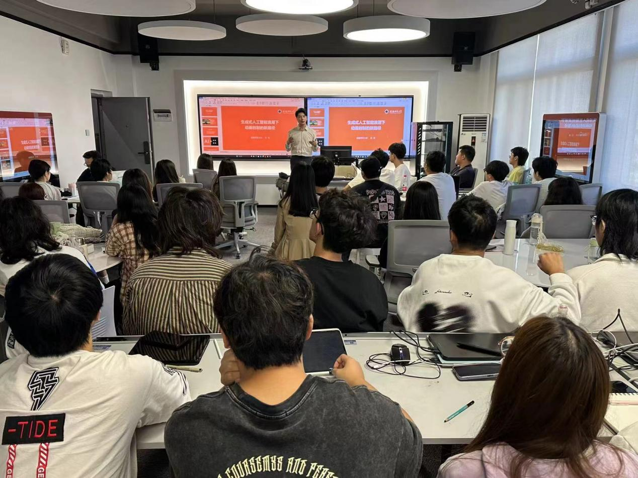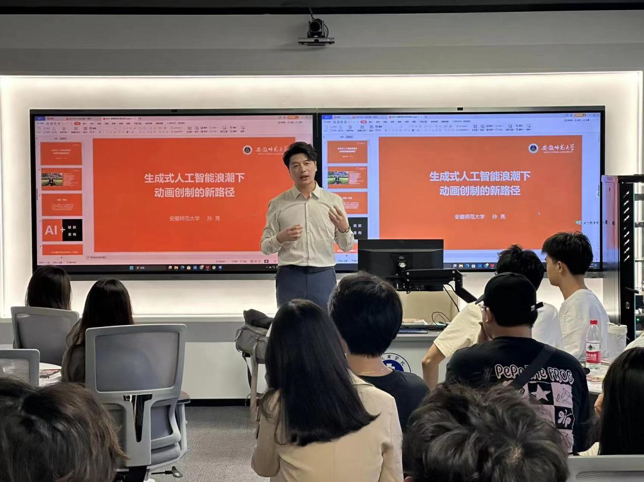 近日,艺术学院动画专业在智慧教室405举办了《生成式人工智能浪潮下动画创制的新思考》学术讲座。此次活动特别邀请安徽师范大学新闻与传播学院教授、动画系主任孙亮老师担任主讲人。艺术学院动画专业120名师生参加讲座。讲座由艺术学院副院长周宇教授主持。