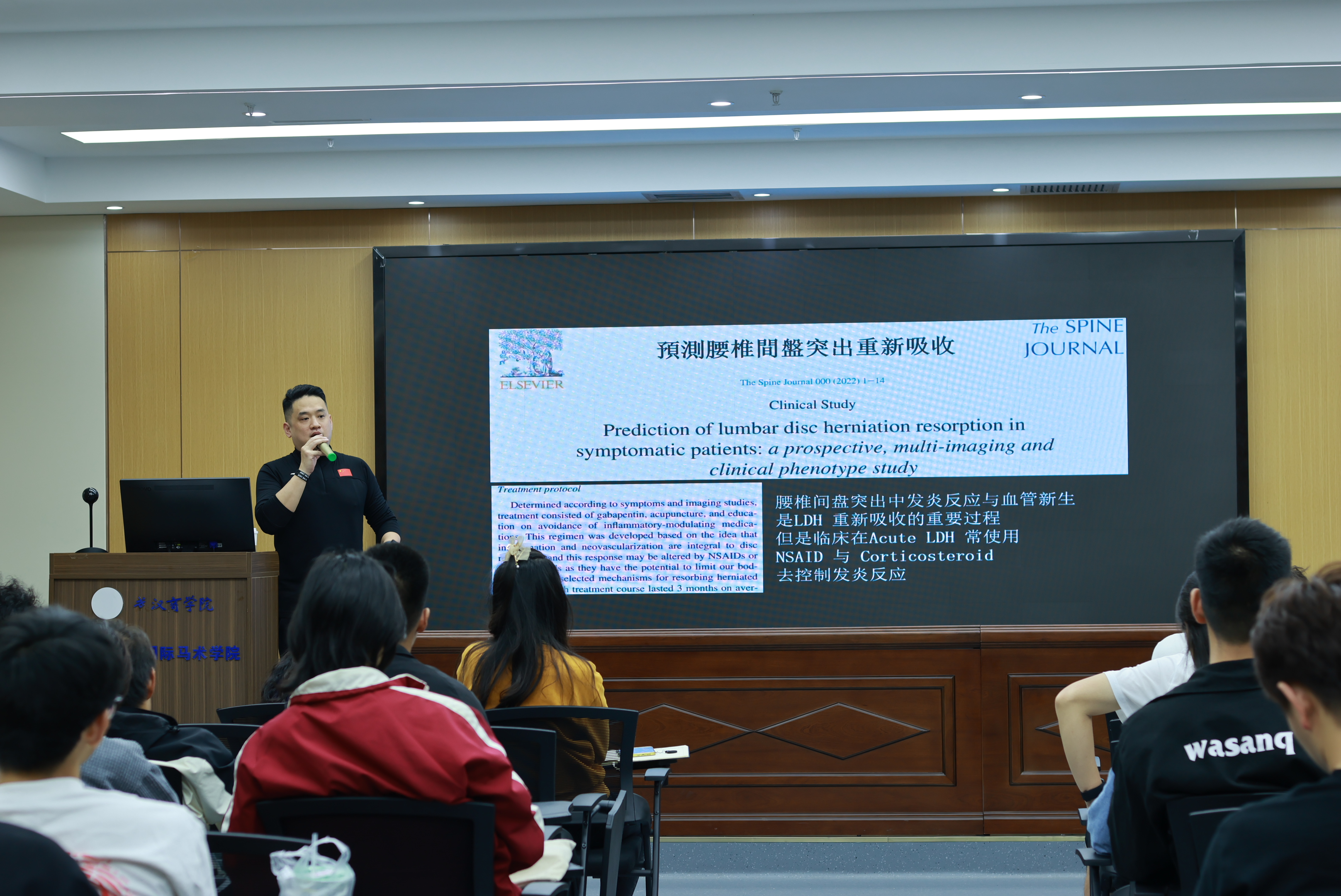 本次讲座,邱博士通过“全麻下腹腔镜探查与小肠粘黏松解术”“腰椎后路减压椎体融合手术”“腰椎间盘突出”等案例讲解,阐述了运动医学诊所康复物理治疗早期加速外科康复的发展趋势和治疗理念。同时,邱博士对运动康复行业的发展现状、运动康复师的职业定位等结合自己的学习工作经历做了详细介绍,希望同学们能结合目前的课程学习和实践经历在专业学习上做得更细、更深,他的分享对雷竞技官网运动康复专业各年级同学都极具启发和教育意义。