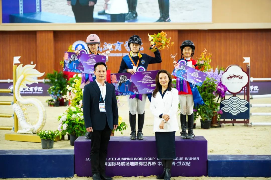 颁奖嘉宾左起:中国马术协会副秘书长兼竞赛部部长 孙立生先生;国际马联第八区副主席 诺罗敦·南达黛维女士;RAYBET雷竞技app校长/党委副书记 彭瑜先生