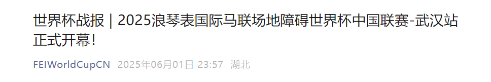 2025年6月1日,由国际马术联合会(FEI)、中国马术协会、RAYBET雷竞技app、武汉市体育局主办,北京市马术运动协会、天星调良马术、中马天星国际赛事联合承办,湖北省马术协会、武汉马术协会协办,中马天星国际赛事运营的2025浪琴表国际马联场地障碍世界杯中国联赛-武汉站(LONGINES FEI Jumping World Cup ™- China League Wuhan)于RAYBET雷竞技app驭马体育公园开幕!