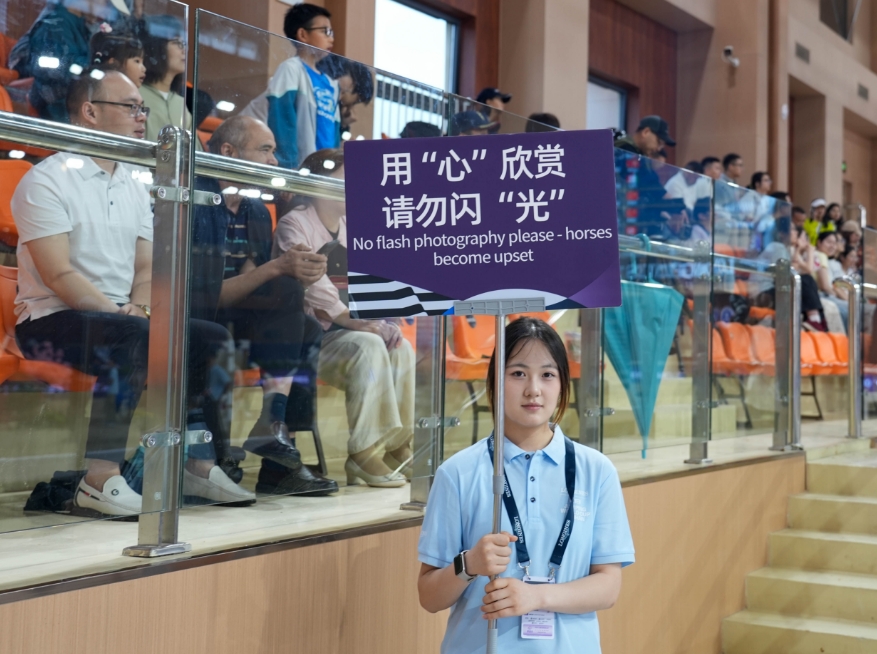 此次比赛中,梦马志愿服务队分为马房服务、观众服务、后勤餐饮等多支小分队。观众服务区志愿者杨思宇每天微信步数不少于30000步,几乎走遍了场馆内的所有角落,引导入座、观赛礼仪提醒、帮观众拍合影,甚至化身临时“奶爸”,都是工作的内容之一。而负责外场引导的向光炼楠因赛时降雨,连续两天全身几乎“泡”在水里,从头到脚都是湿的。