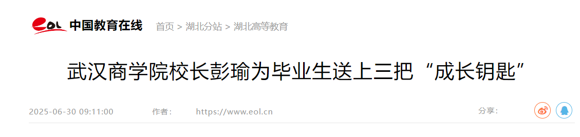 亲爱的同学们,当“不信邪”的创新魄力、“不服周”的格局意识、“不畏难”的韧性品质交汇时,开启的正是武汉这座城市的英雄光谱。愿你们带好这三把钥匙,挥别承载着青春记忆的武商院,奔赴人生的新征程。那些求学路上的朝夕相伴、课堂内外的求知探索、成长途中的点滴收获,早已化作母校与你们之间的情感纽带。曾经吐槽了千万遍的琐琐碎碎,此刻都镀上了温柔的光。以后再没有门禁了,但要记得早点回家;以后再没有点名了,但要记得按时上班;以后晚上再也不熄灯了,但是希望你们每天照顾好自己、早点睡觉!无论未来你们在何方逐梦,是在顺境中高歌,还是在逆境里独行,母校始终愿做你们疲惫时的避风港、迷茫时的指路灯,让这份牵挂伴你们远航!