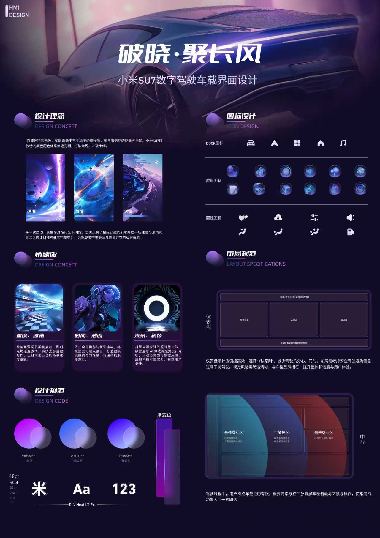 然而,从创意确定到作品成型,整个过程耗时约一个月,期间并非一帆风顺。“最初我们曾考虑以比亚迪车型为设计对象,但深入分析后发现,其偏向商务化的定位与我们年轻化的设计方向不符,最终果断换成小米 SU7。”队员刘云昊回忆/“创作中还经历过两次改版,第一次采用的是纯紫色系,因为与背景融合问题不得不调整,甚更紧张的是,在比赛截止前几个小时,团队还在加急完成应用图标的二次优化,只为呈现更完美的效果。”